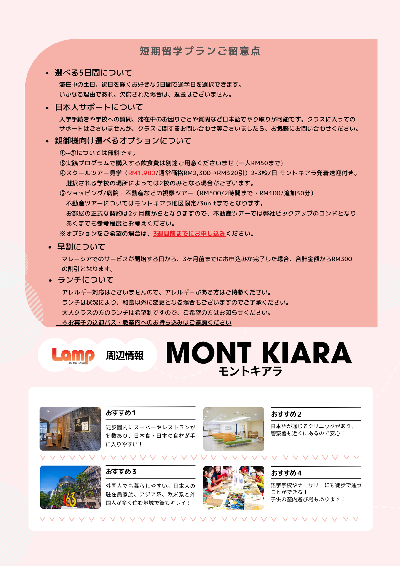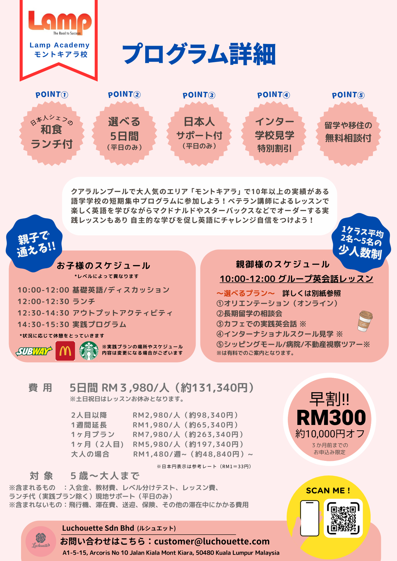 | 1週間短期留学パック(1名価格) | (RM3,980)131,340円/名 |