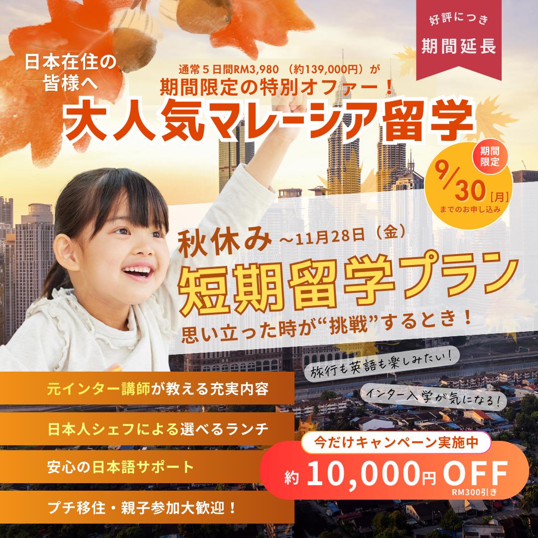 お仕事などで英語の必要性を感じられていらっしゃる親御様や、今後のマレーシア移住を考慮して短期でも英語の学習を始められたい方にとって、親子で英語留学することができるのはとても貴重な時間になるでしょう。