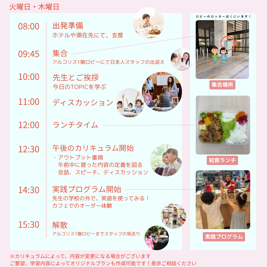 (時期によって内容が変更になる場合もございます。またオリジナルカリキュラム設定も可能です。ご相談ください)