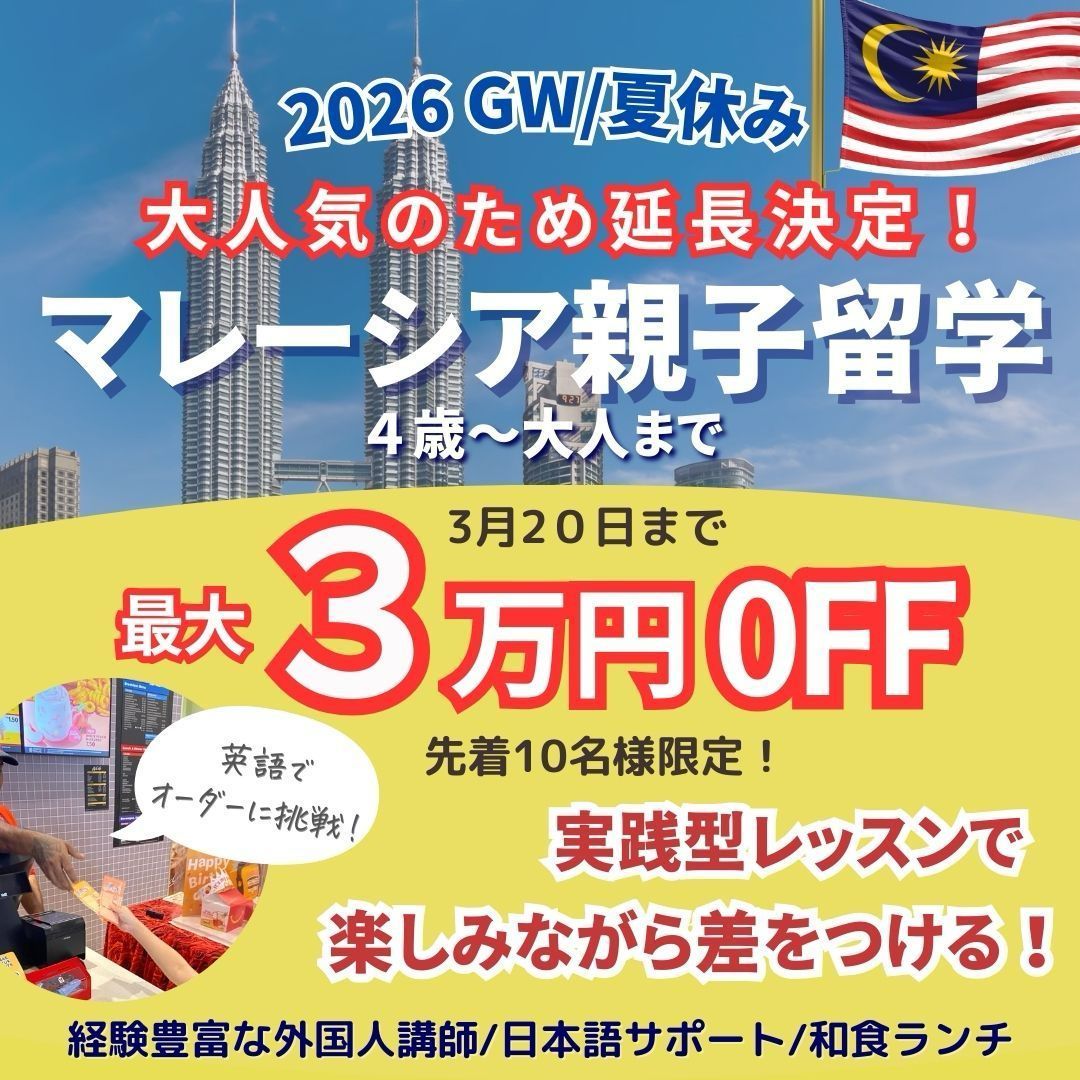 マレーシア親子留学プログラムのキャンペーン延長が決定しました。