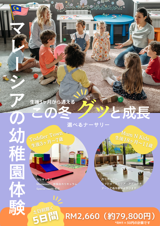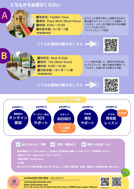 ルシュエットのマレーシア親子留学プログラムでは、ご希望のスケジュール・カリキュラム・お子様のご年齢に合わせて、お子様のナーサリーをお選びいただくことができます。